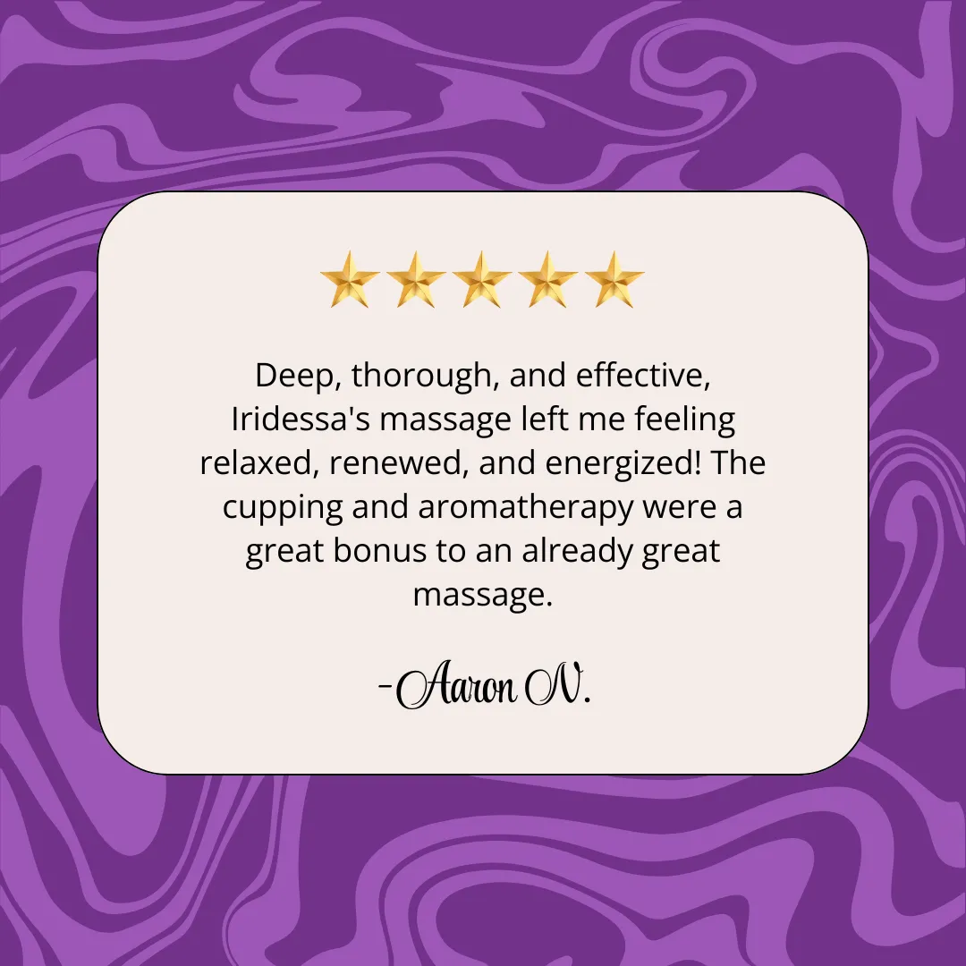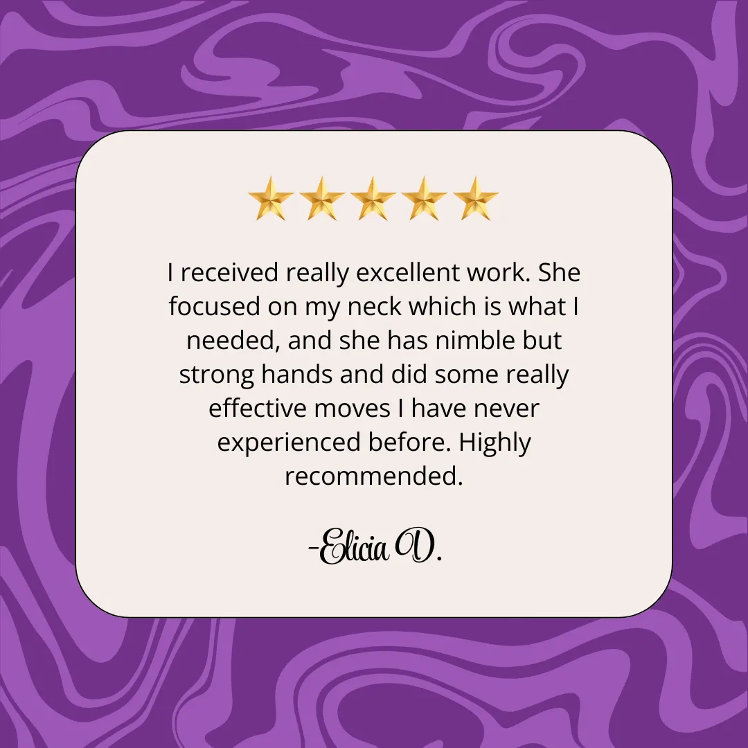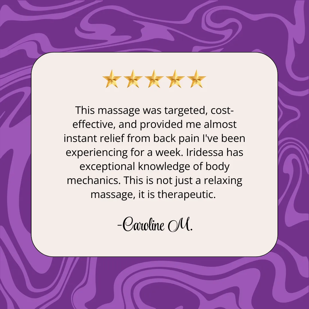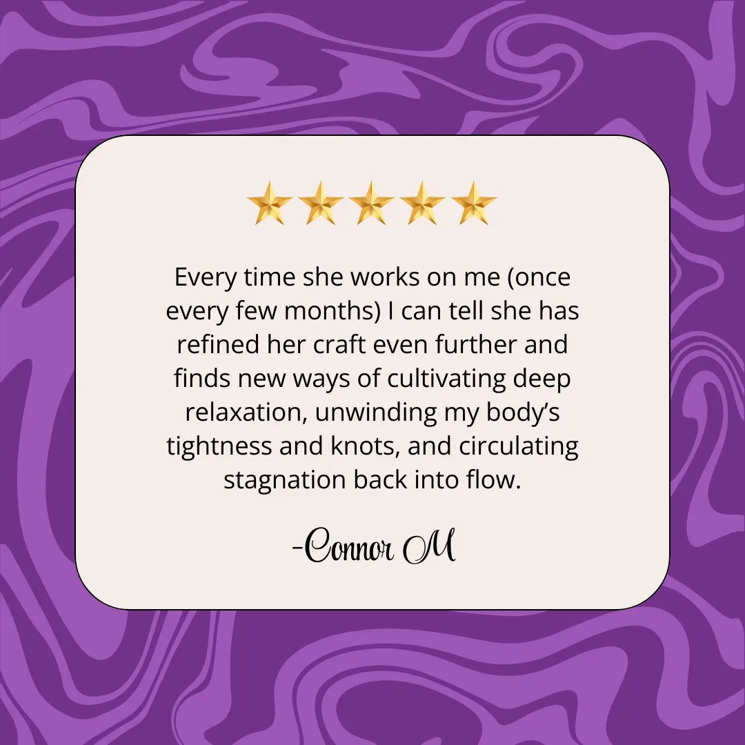 A: The amount of massage time booked begins only once the massage itself has started. Most therapists count the arrival time as part of your paid time, meaning that if you booked an hour massage at 11am and we don't get started until 11:15am, you only would have 45mins of time for your massage. I cushion my appointments with enough time to allow for any necessary setup/breakdown or discussion, so that if you pay for an hour, you get the full hour! If you have somewhere to be promptly after your massage, please note that it may take several minutes to decompress after your massage, so please plan your day accordingly.