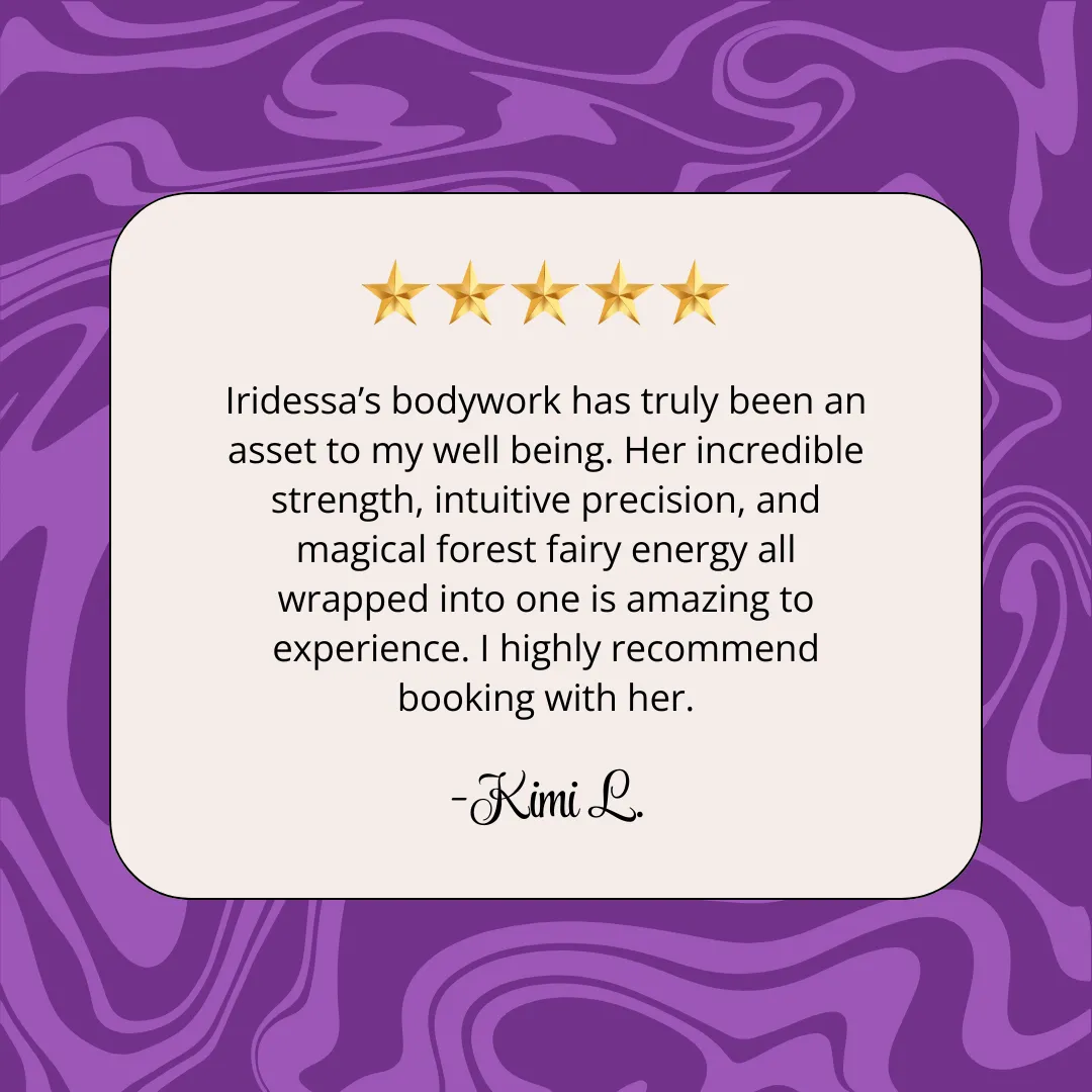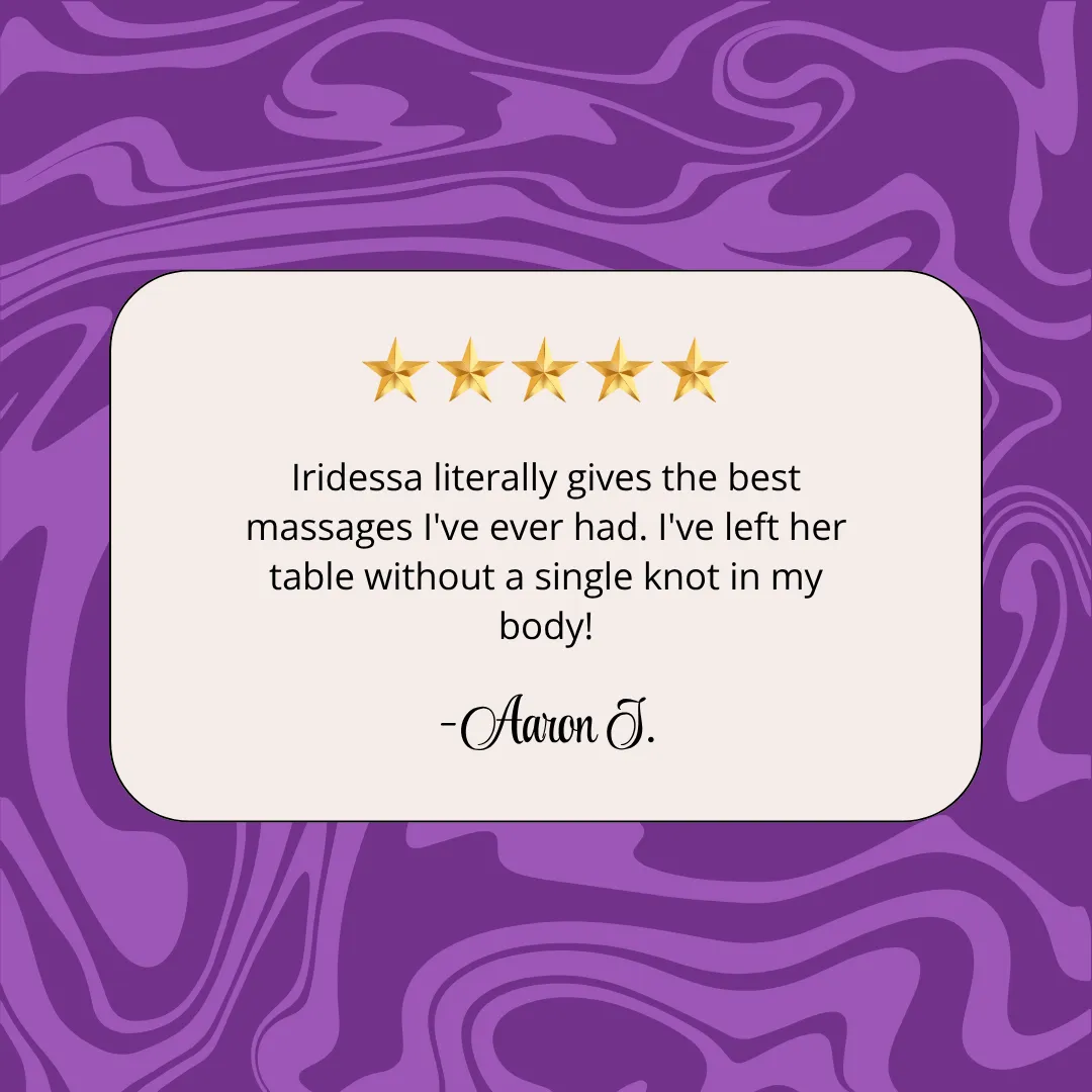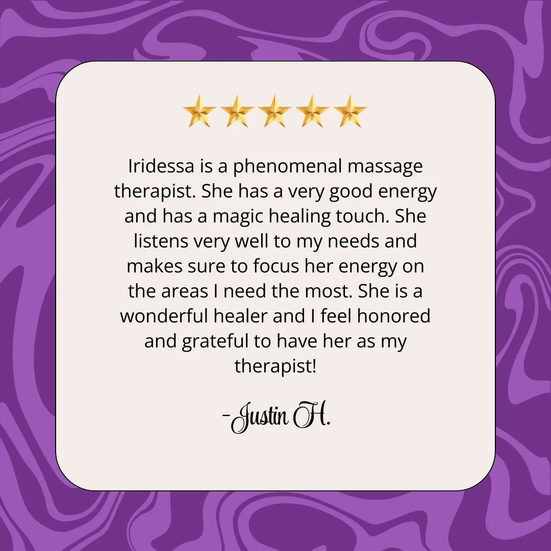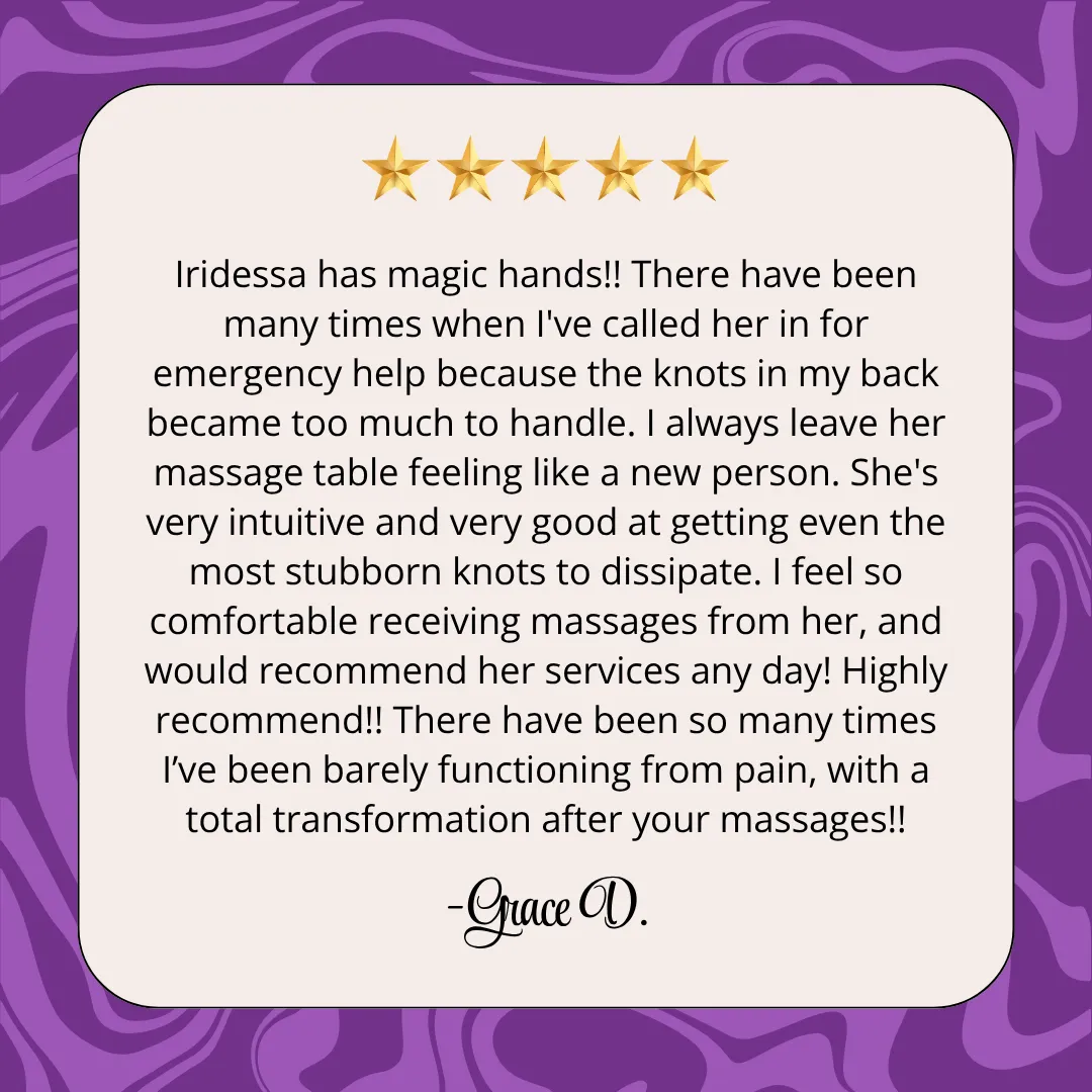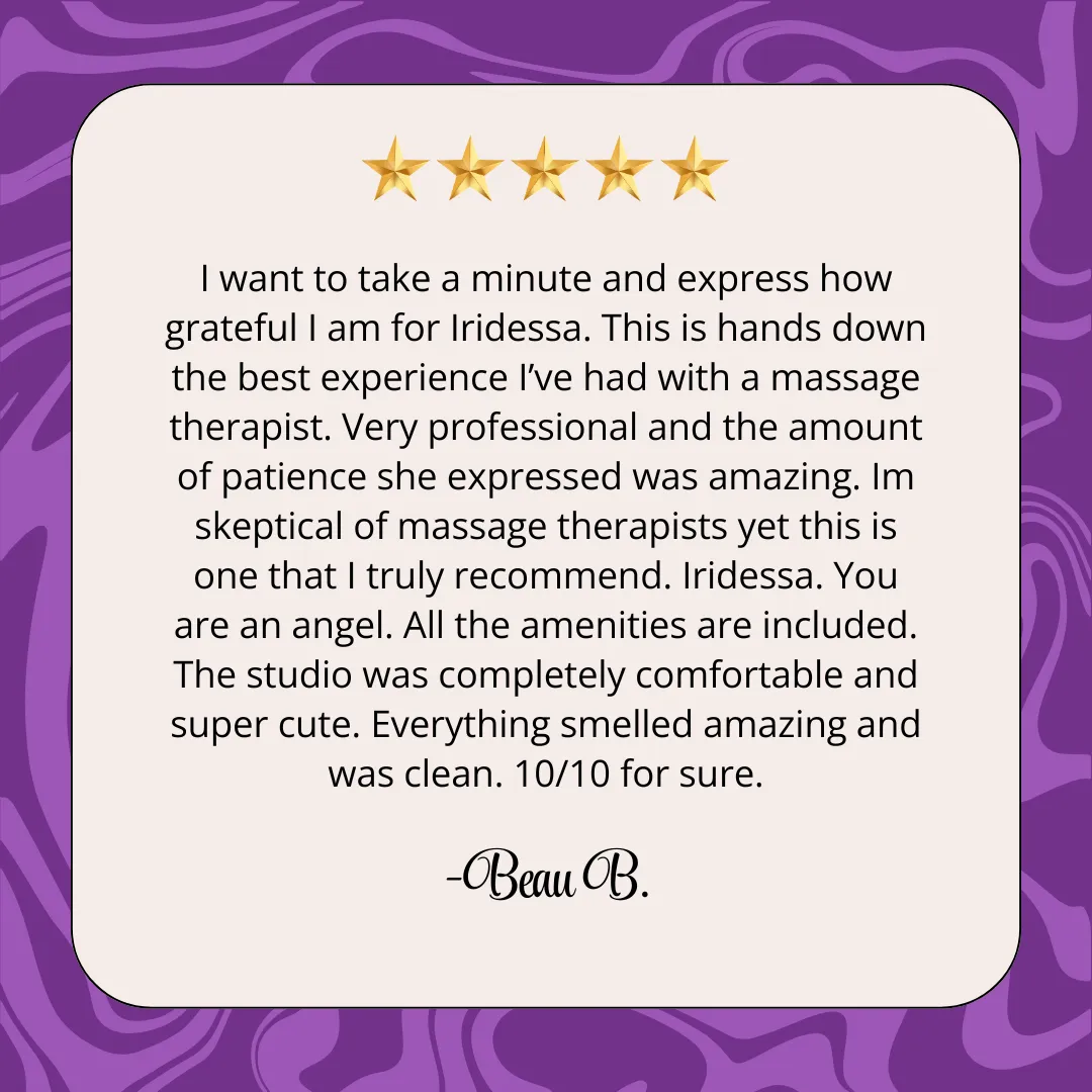 A: The amount of massage time booked begins only once the massage itself has started. Most therapists count the arrival time as part of your paid time, meaning that if you booked an hour massage at 11am and we don't get started until 11:15am, you only would have 45mins of time for your massage. I cushion my appointments with enough time to allow for any necessary setup/breakdown or discussion, so that if you pay for an hour, you get the full hour! If you have somewhere to be promptly after your massage, please note that it may take several minutes to decompress after your massage, so please plan your day accordingly.