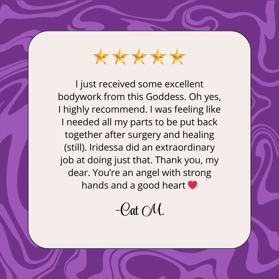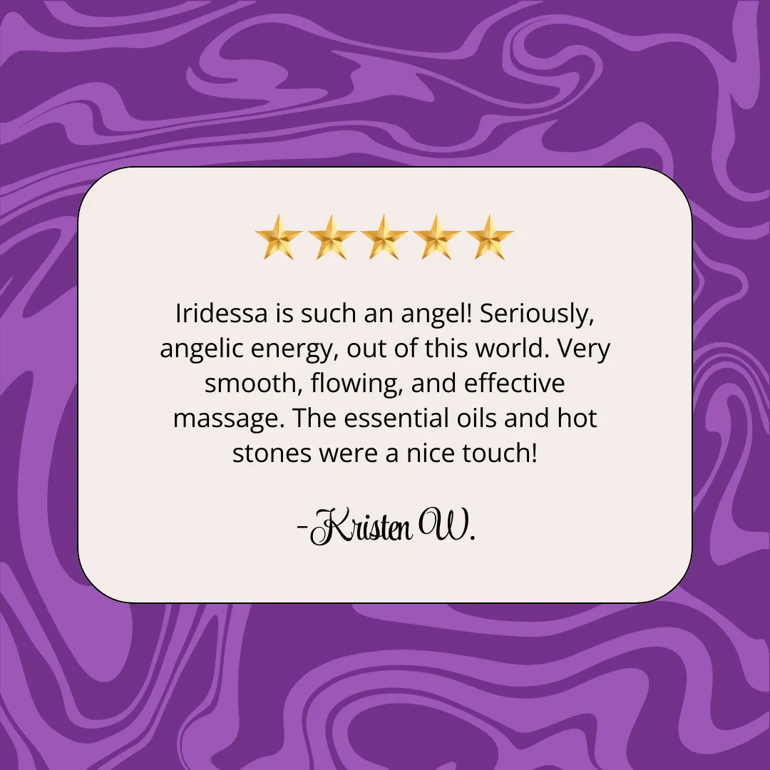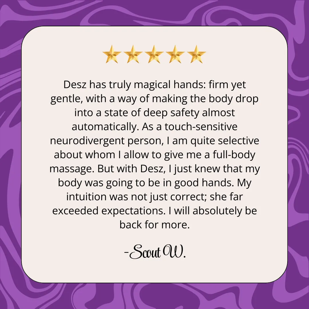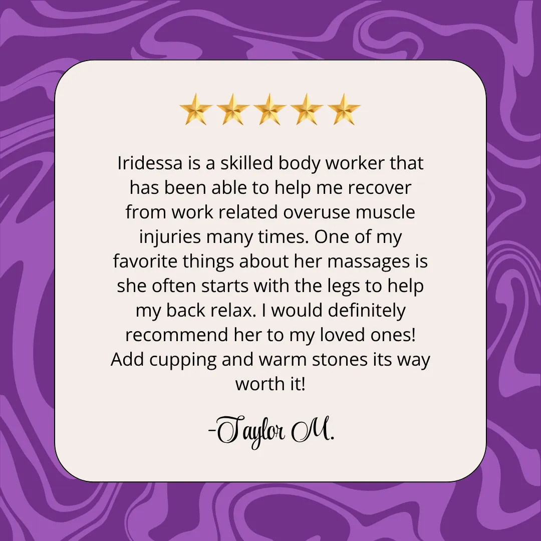 A: The amount of massage time booked begins only once the massage itself has started. Most therapists count the arrival time as part of your paid time, meaning that if you booked an hour massage at 11am and we don't get started until 11:15am, you only would have 45mins of time for your massage. I cushion my appointments with enough time to allow for any necessary setup/breakdown or discussion, so that if you pay for an hour, you get the full hour! If you have somewhere to be promptly after your massage, please note that it may take several minutes to decompress after your massage, so please plan your day accordingly.
