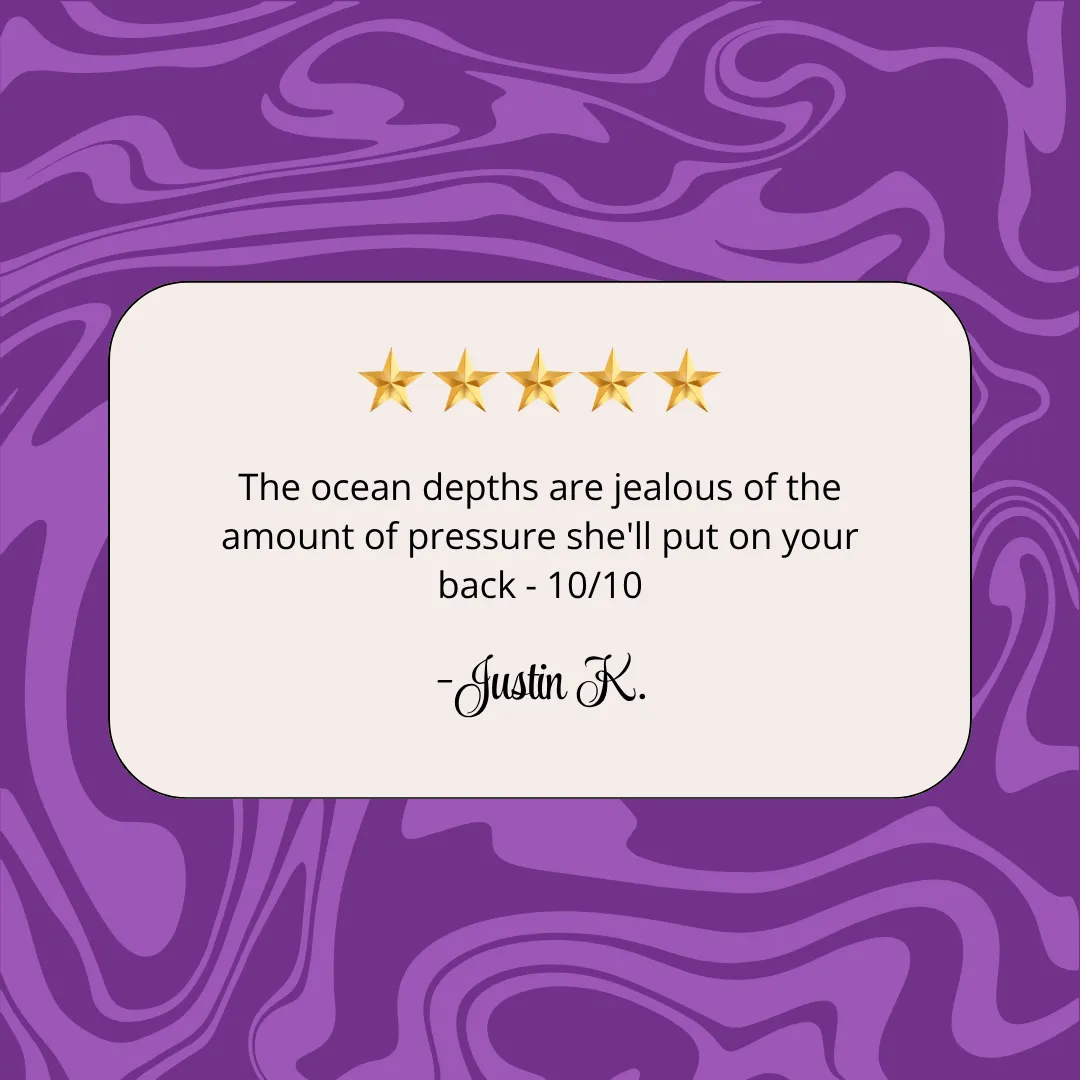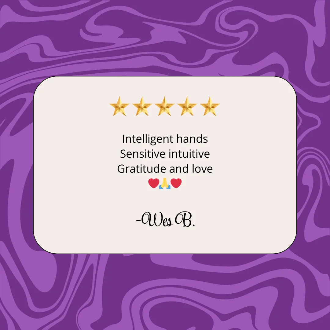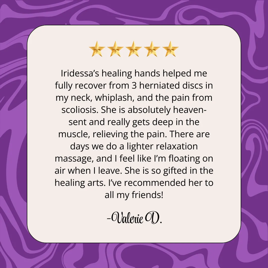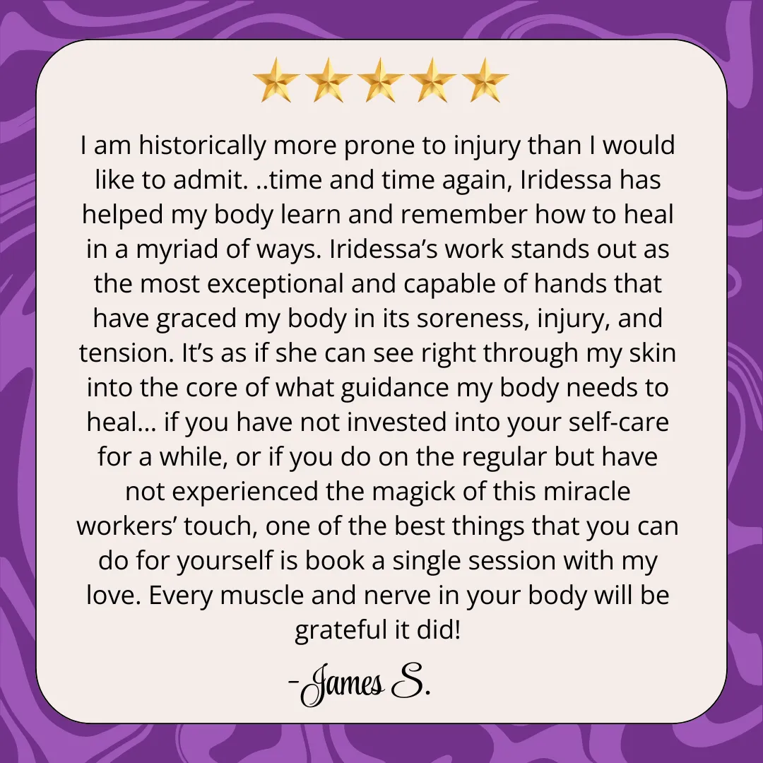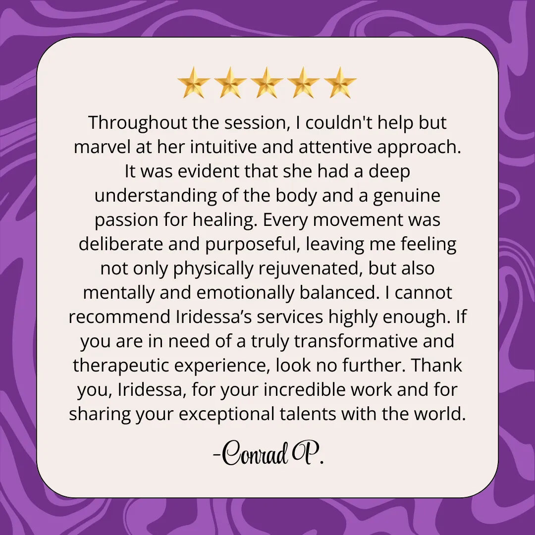 A: The amount of massage time booked begins only once the massage itself has started. Most therapists count the arrival time as part of your paid time, meaning that if you booked an hour massage at 11am and we don't get started until 11:15am, you only would have 45mins of time for your massage. I cushion my appointments with enough time to allow for any necessary setup/breakdown or discussion, so that if you pay for an hour, you get the full hour! If you have somewhere to be promptly after your massage, please note that it may take several minutes to decompress after your massage, so please plan your day accordingly.
